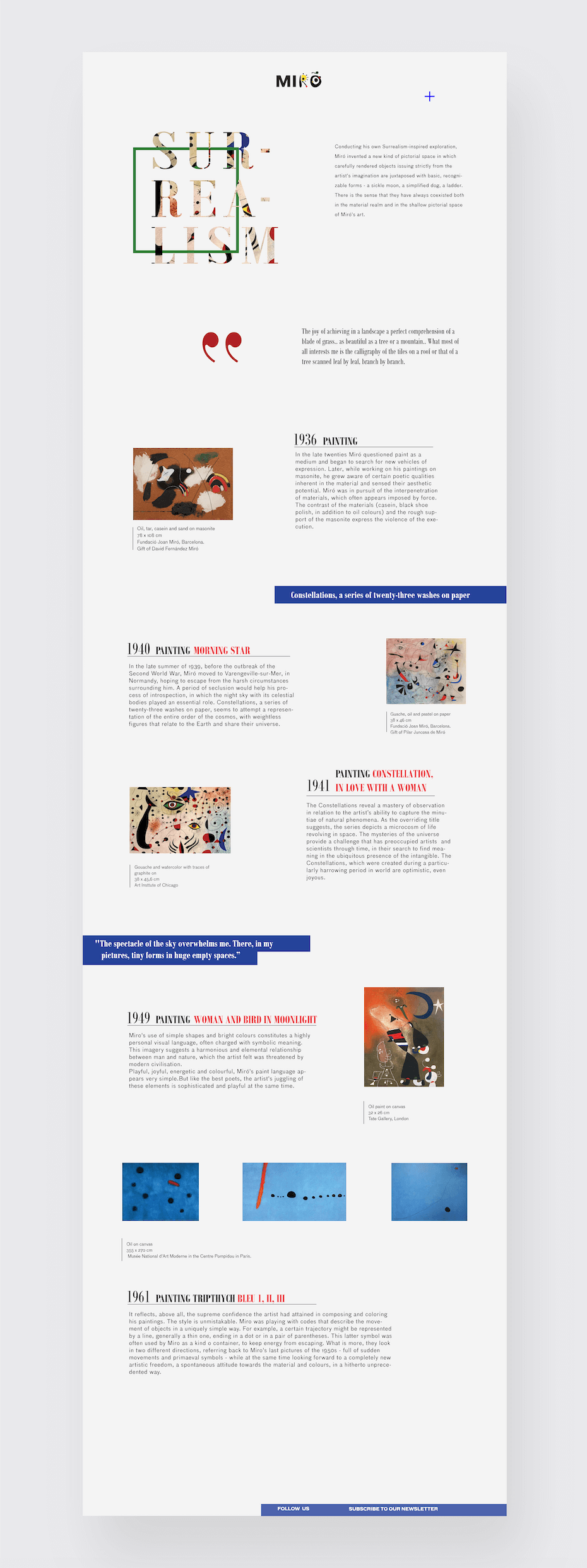 In this project I studied, reused and adapted Mirò's artistic language in order to best represent visually, his works and history. I combined the characteristic features of his style to design a landing page dedicated to him, and the related logo. Conducting his own Surrealism-inspired exploration, Miró invented a new kind of pictorial space in which carefully rendered objects issuing strictly from the artist's imagination are juxtaposed with basic, recognizable forms - a sickle moon, a simplified dog, a ladder. There is the sense that they have always coexisted both in the material realm and in the shallow pictorial space of Miró's art. Miró often worked with a limited palette, yet the colors he used were bold and expressive. His chromatic explorations, which emphasized the potential of fields of unblended color to respond to one another, provided inspiration for a generation of Color Field painters. Miró's art never became fully non-objective. Rather than resorting to complete abstraction, the artist devoted his career to exploring various means by which to dismantle traditional precepts of representation. Miró's radical, inventive style was a critical contributor in the early twentieth-century avant-garde journey toward increasing and then complete abstraction. Artists have traditionally confined themselves to visual expression in a single medium with occasional forays into other materials. However, Miró was, in a sense, a modern renegade who refused to limit himself in this regard. While he explored certain themes such as that of Mother and Child repeatedly throughout his long career, Miró did so in a variety of media from painting and printmaking to sculpture and ceramics, often achieving surprising and disparate results.