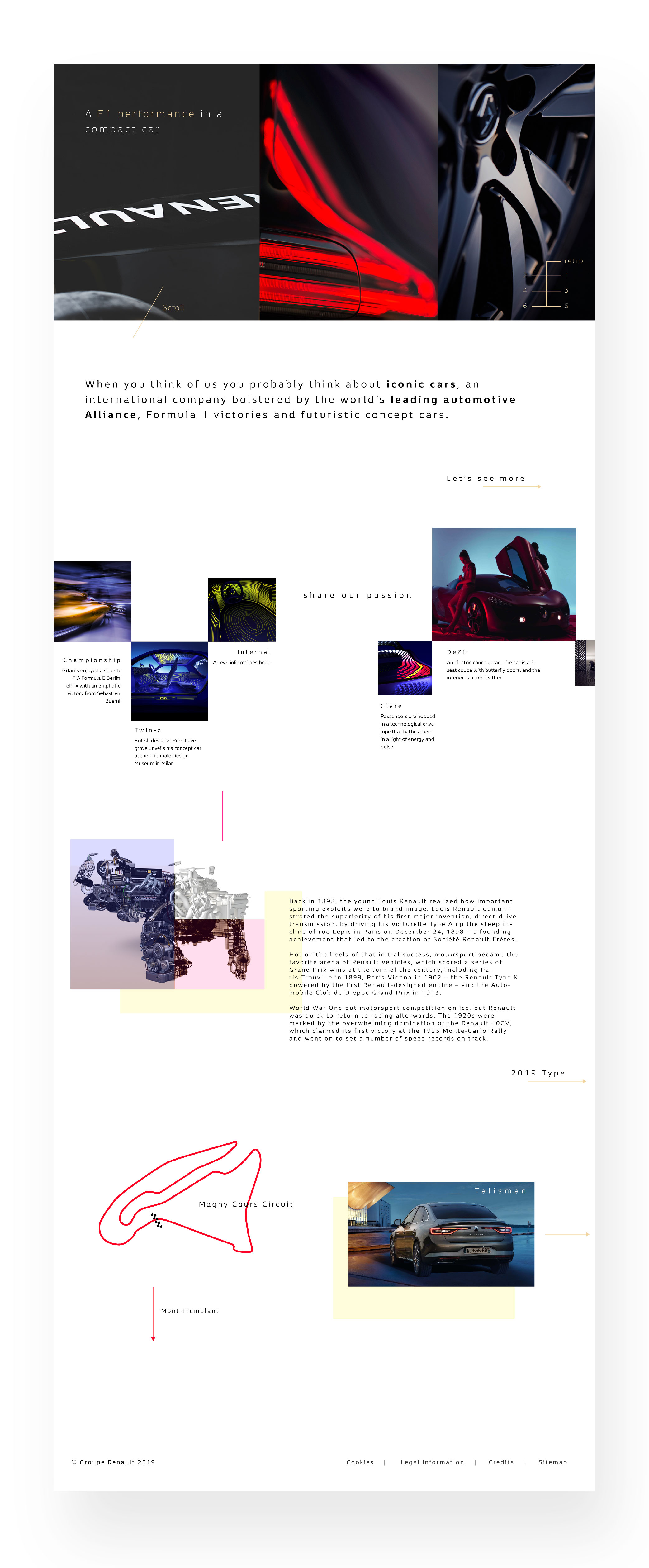I've designed this celebratory landing page for Groupe Renault. Renault's design aims to give ample space to emotion through a simple, sensual and welcoming style. Interpreted primarily by a series of Concept Cars, since 2012 this language of forms has gradually begun to extend to recent models in the range as well. The page offers a gallery of innovative concepts and embrace the New Renault's Visual Style.